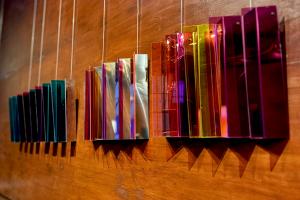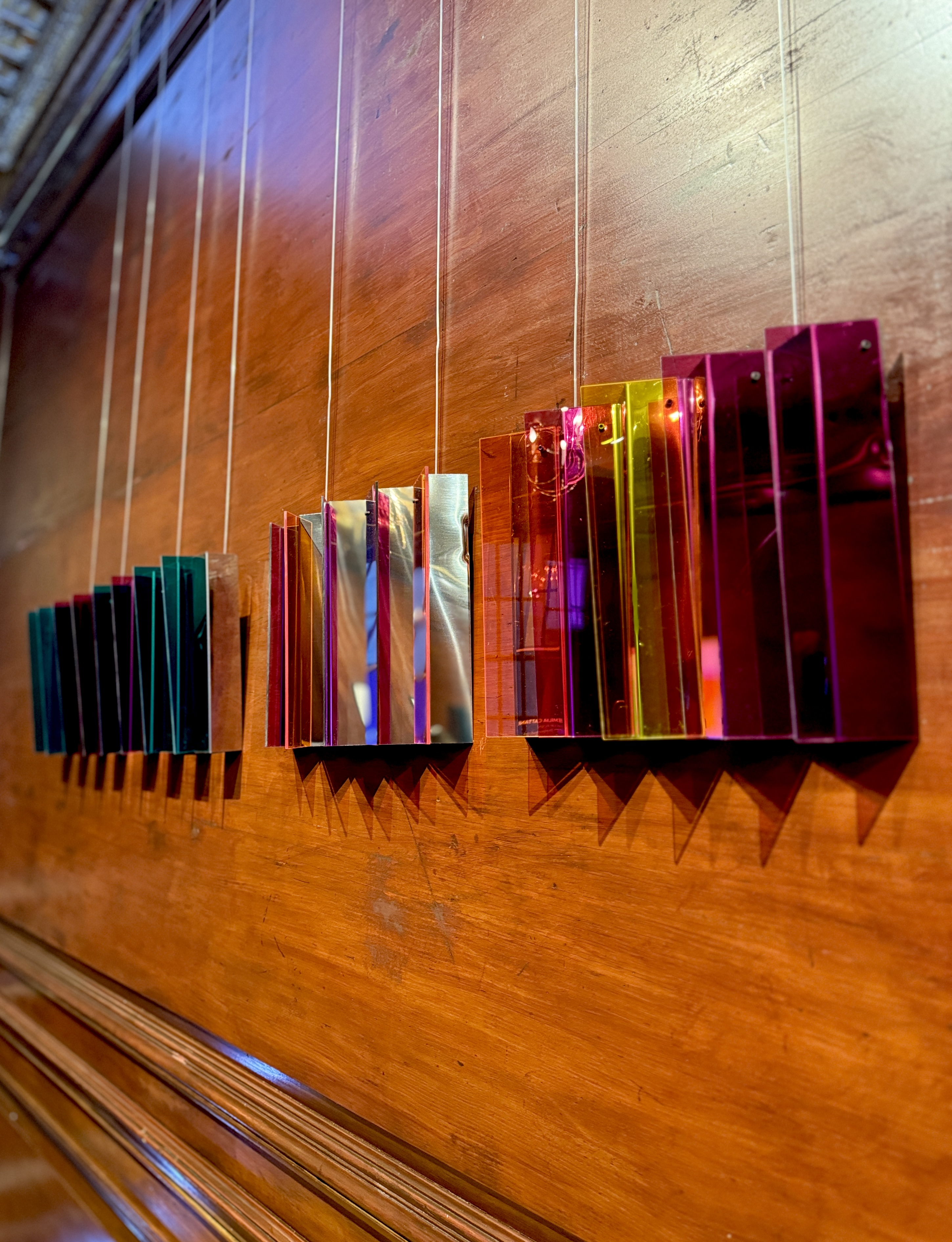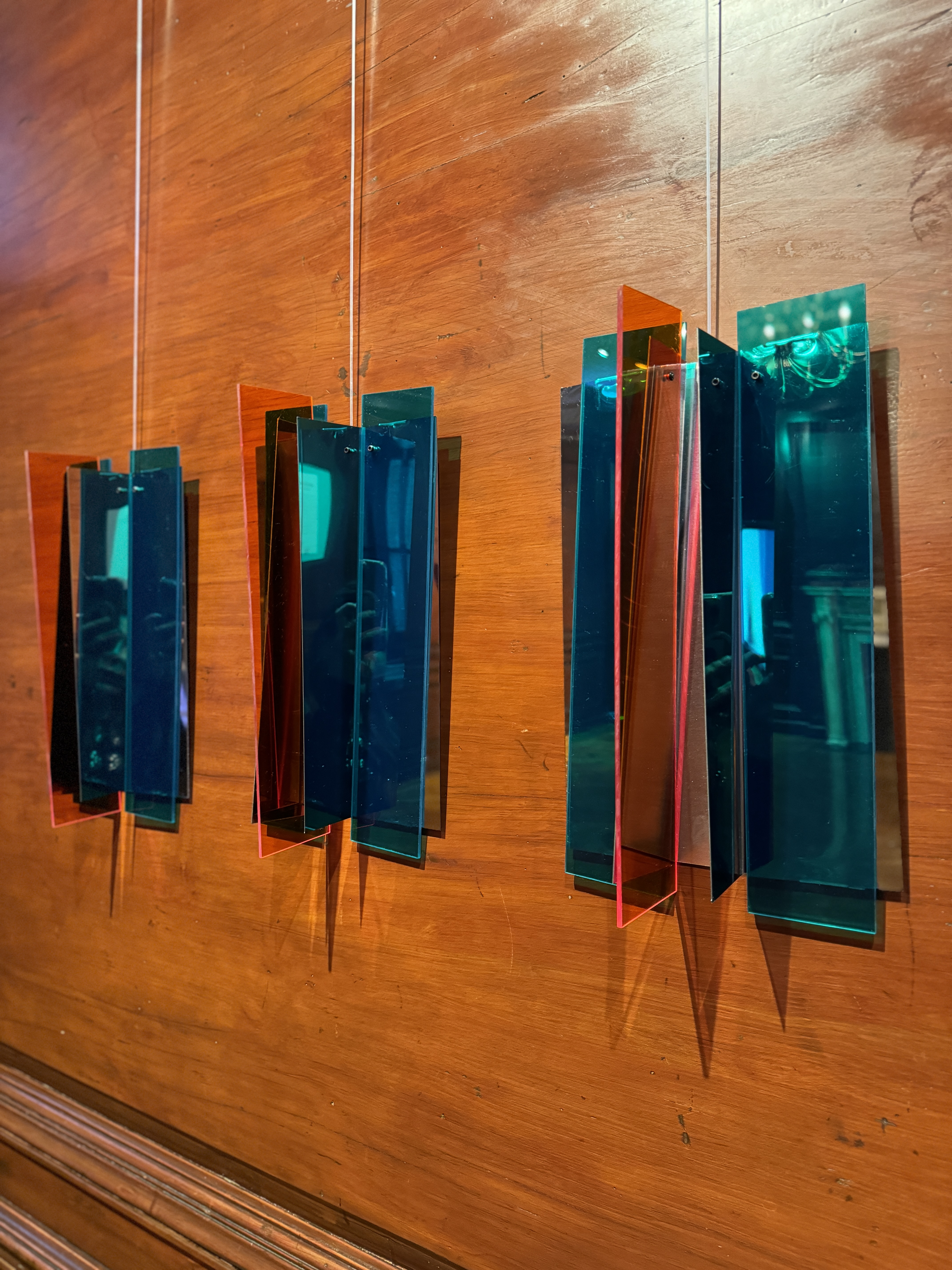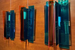 Meanwhile, Transitions of Form, by María Emilia Cattaneo, invites viewers into a perceptual experience in constant motion. Her artistic research, linked to the traditions of kinetic and optical art, explores the relationship between form, color, light, and reflection through the use of mirrored steel, acrylic, and folded planes. The works transform space and challenge the gaze, generating visual shifts that make perception itself an essential part of the aesthetic experience.