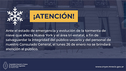 Ante el estado de emergencia y la evolución de la tormenta de nieve que afecta a Nueva York y al área tri-estatal, y a fin de salvaguardar la integridad del público usuario y...