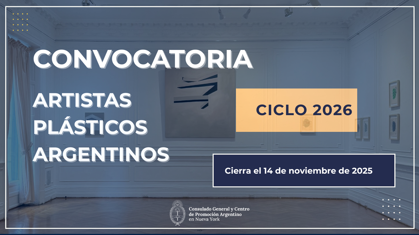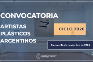 El Consulado General y Centro de Promoción de la República Argentina en Nueva York invita a artistas plásticos argentinos a presentar sus propuestas para participar en el Ciclo de Exhibiciones Culturales 2026, un programa destinado a difundir y promover el arte argentino en Nueva York y la región bajo la jurisdicción del Consulado General.