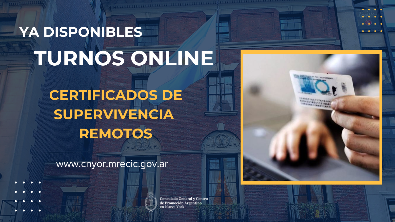 El Consulado General de la Argentina en Nueva York informa que ya se encuentran habilitados los turnos online para la tramitación de Certificados de Supervivencia en modalidad a distancia (remota...